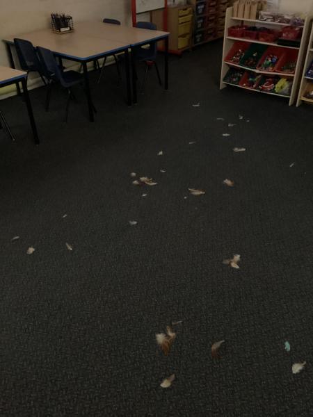 We arrived to find our carpet covered in feathers and lots of hooting noises coming from the corner! We also had a fluffy visitor on our board!
